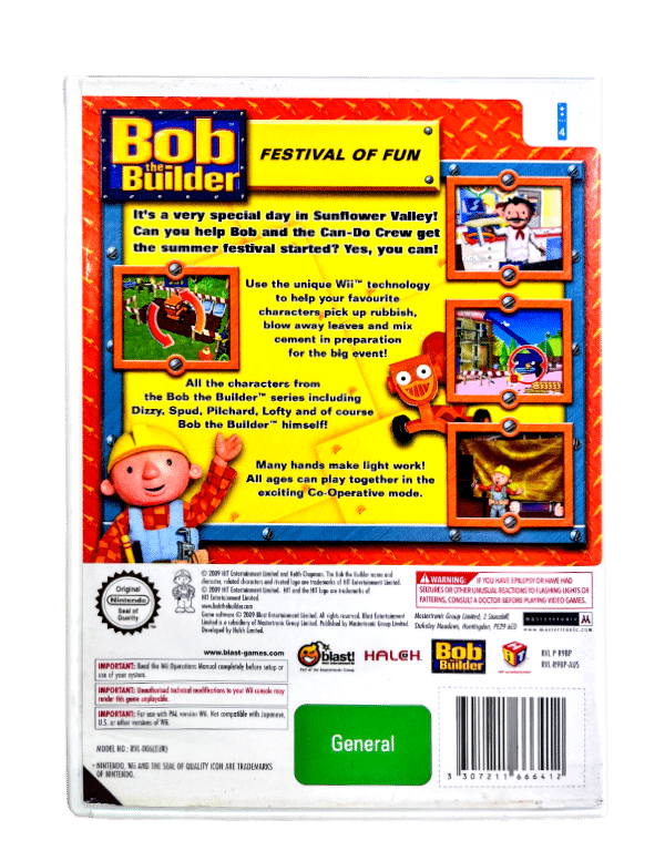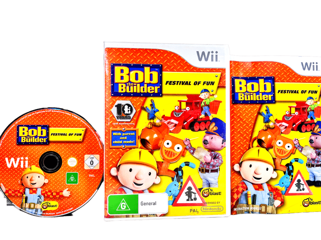 Good Condition & 100% Complete with Contents: Bob the Builder: Festival of Fun for Nintendo Wii. This preowned game comes complete with case + cover + manual / booklet + game disc. Some light superficial markings / cosmetic scratches, but these are very minor imperfections which do not affect game play in any way.