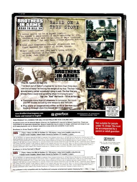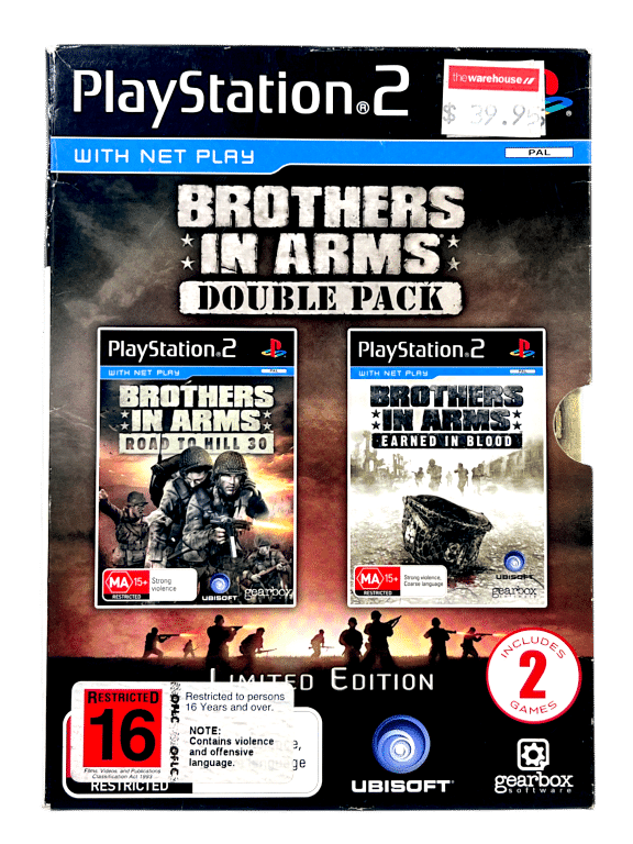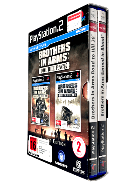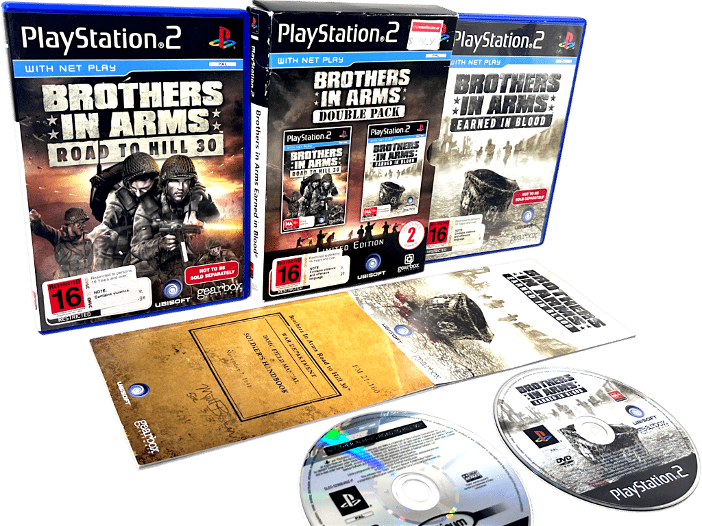 Excellent condition & 100% complete with contents: BROTHERS IN ARMS TWO GAME BOX SET for SONY PlayStation 2 / PS2. This preowned authentic double shot boxed release includes both games – each in mint condition and complete with cases + covers + manuals / booklets + game discs. The limited release Display Box is also in very good condition with minor shelf wear pictured. Includes Brothers In Arms Road to Hill 30 AND Brothers In Arms Earned In Blood. Refer photographs. Earned in Blood features a Platinum Edition game disc. All inner contents are superb.