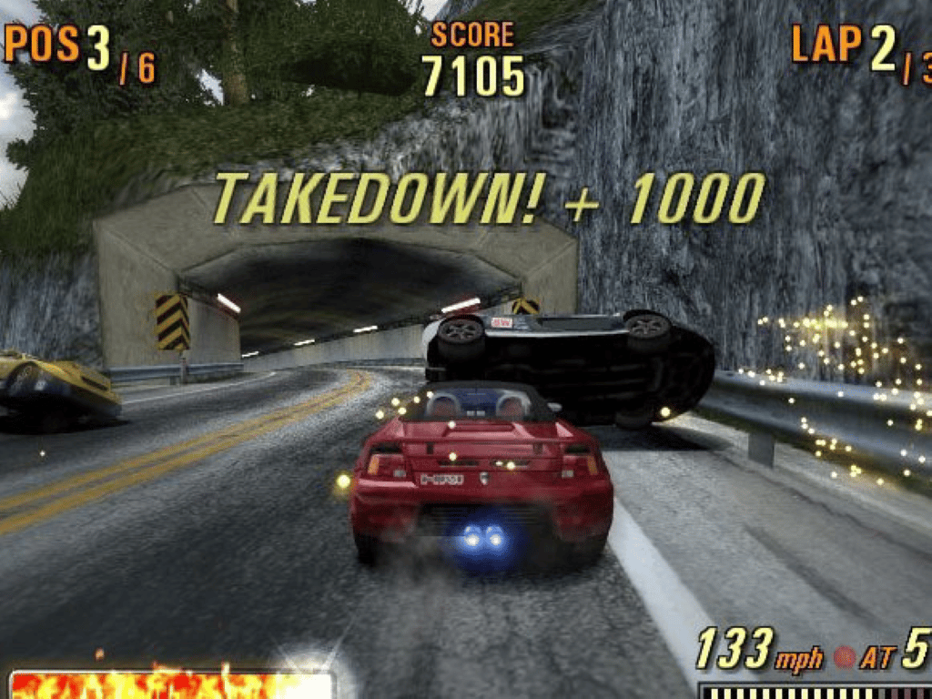 Burnout 3 challenges you to crash into (and through) busy intersections, while creating as much damage as possible. You can battle your way to the front of the pack by taking down rivals and causing spectacular crashes. For those who thirst for crashes, the game includes a crash mode that rewards you for creating massive pileups. With multiplayer gameplay, more than 100 events, and 40 tracks, Burnout 3 provides intense speed and action.