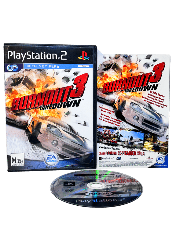 Excellent condition & 100% complete with contents: BURNOUT 3 Takedown for SONY PlayStation 2 / PS2. This preowned game comes complete with case + cover + manual / booklet + game disc. The faintest of markings and surface scratches on the disc, but these are purely cosmetic and do not hinder performance or gameplay in any way. Case is a Black DVD case.