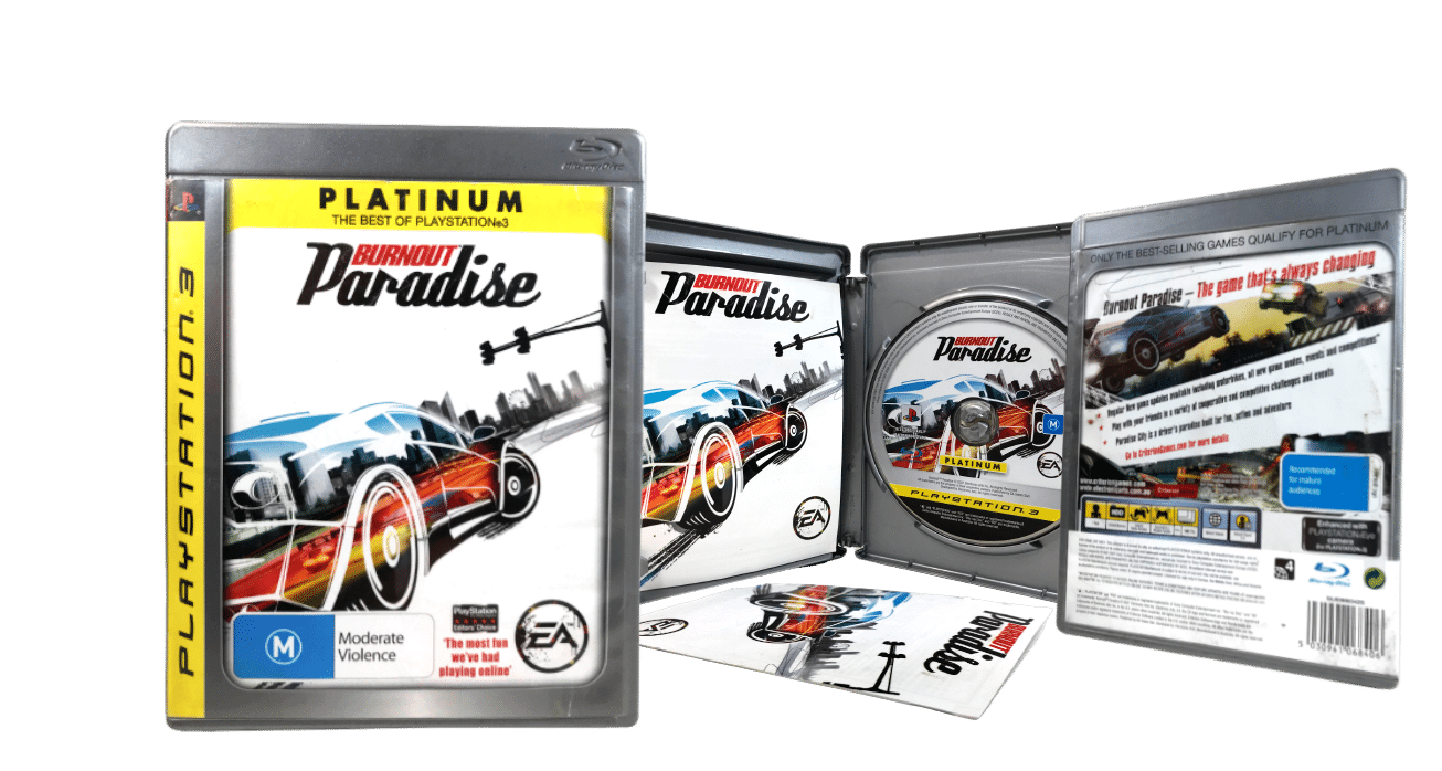 AUTHENTIC PLATINUM EDITION in Excellent Condition & 100% Complete with Contents: BURNOUT PARADISE for SONY PlayStation 3 / PS3. This preowned game comes complete with case, cover, and game disc.