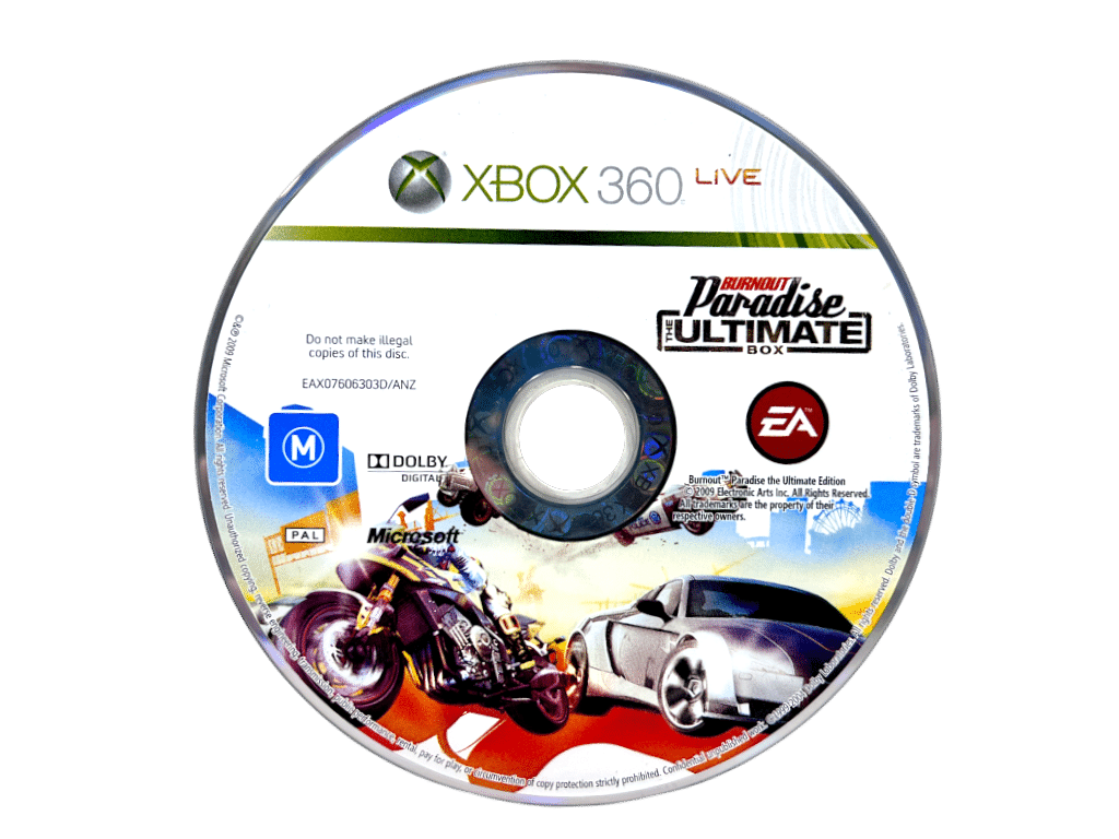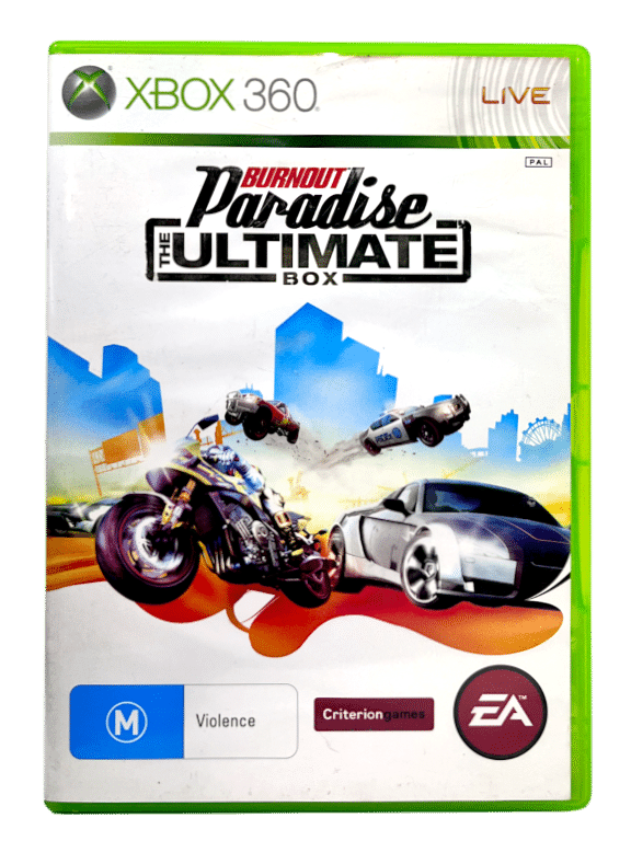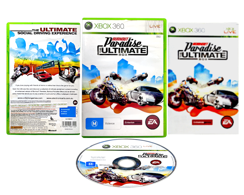 BURNOUT PARADISE The ULTIMATE BOX for XBox 360. This preowned game is in very good condition and includes original case + cover + game disc. Cover has a light water mark, and the tiny plastic centre guard of the disc has a small plastic crack, but this is purely cosmetic and does not extend to the game data or impede gameplay or performance in any way. Please note that the MANUAL IS NOT INCLUDED in this listing, but the game is self-explanatory, and the instructions are readily available online.