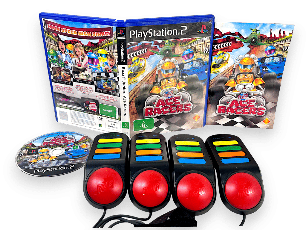 COMPLETE BUZZ JUNIOR PLAYING BUNDLE (GAME + BUZZERS)! BUZZ JUNIOR ACE RACERS The Game PLUS Official Buzzers / Buzz Controllers to play! This preowned genuine SONY PlayStation 2 / PS2 Buzz Junior Bundle is in excellent condition and perfect working order. Game comes complete with case, cover, manual / booklet, and game disc. Buzzers fully tested and operating flawlessly. Buzzers are authentic black with colour border editions (refer slideshow). A complete player’s bundle, ready for the kids or entire family!
