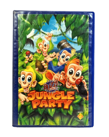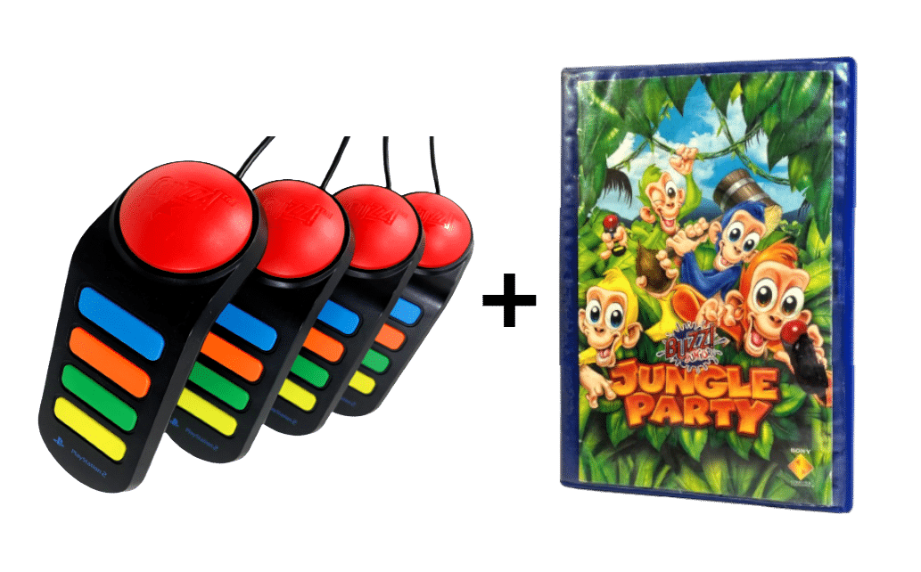 RARE FIND: BUZZ JUNIOR JUNGLE PARTY COMPLETE WITH BUZZERS (EVERYTHING NEEDED TO PLAY!) for SONY PlayStation 2 / PS2. This preowned game disc is in Excellent Condition and includes case and manual (please note that the original paper cover is not included, but the booklet looks just as good in its place as pictured). Buzzers also in excellent condition. A complete playing bundle, ready for the whole family to play!