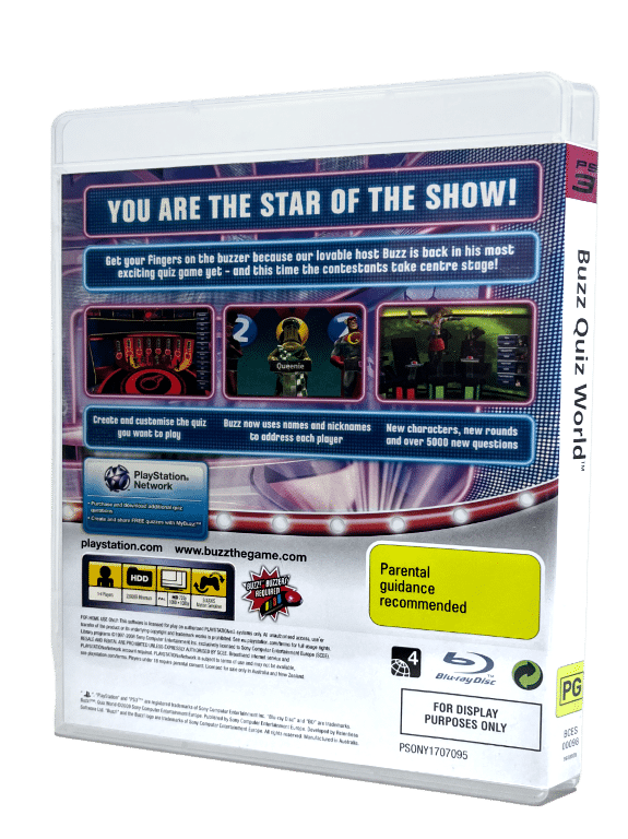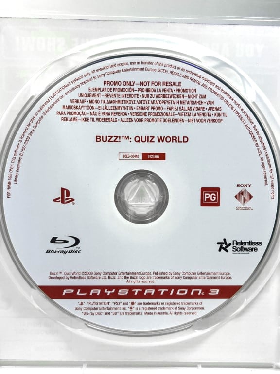 Mint & 100% complete with contents: Buzz Quiz World for SONY PS3. This preowned game is in pristine condition, and is a rare Official Pre-Release edition, complete with case, cover, and game disc. A worthy collector’s item.