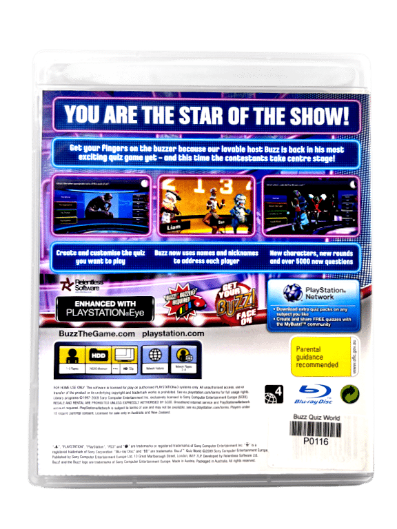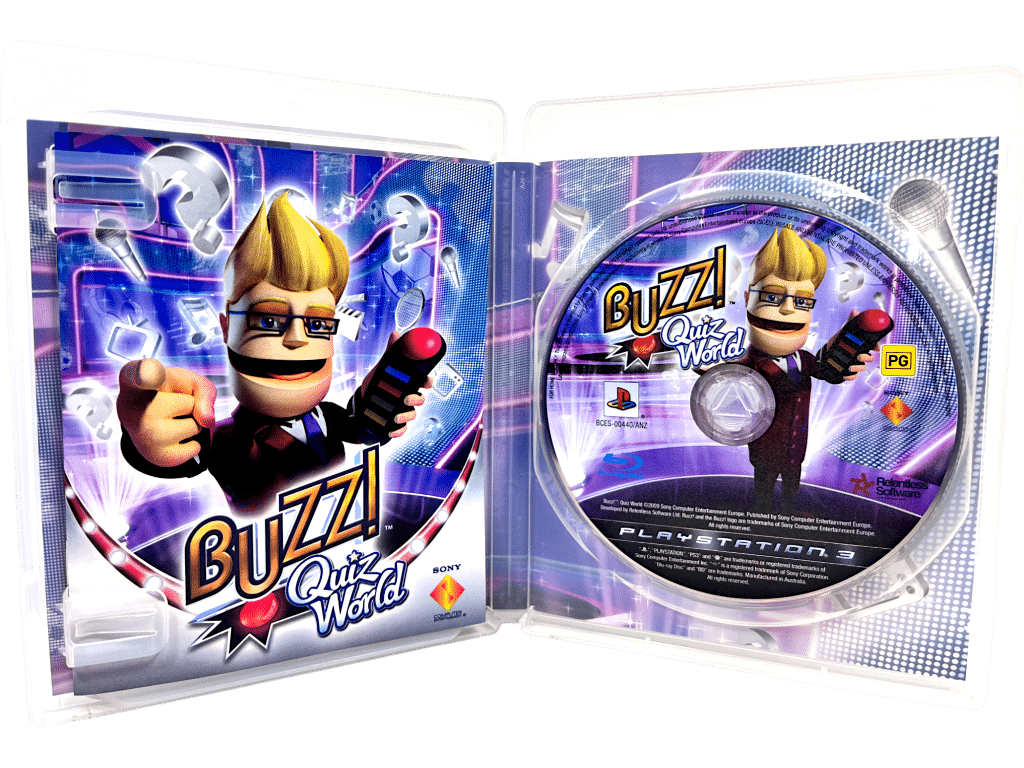 Genuine NZ/AUS Edition in mint & 100% complete with contents: Buzz Quiz World for SONY PS3. This preowned game is in pristine condition, and is a genuine New Zealand release with the signature “PG” classification embedded in the cover art and on the game disc. Game comes complete with case + cover + manual / booklet + game disc. A tidy and complete collector’s item.