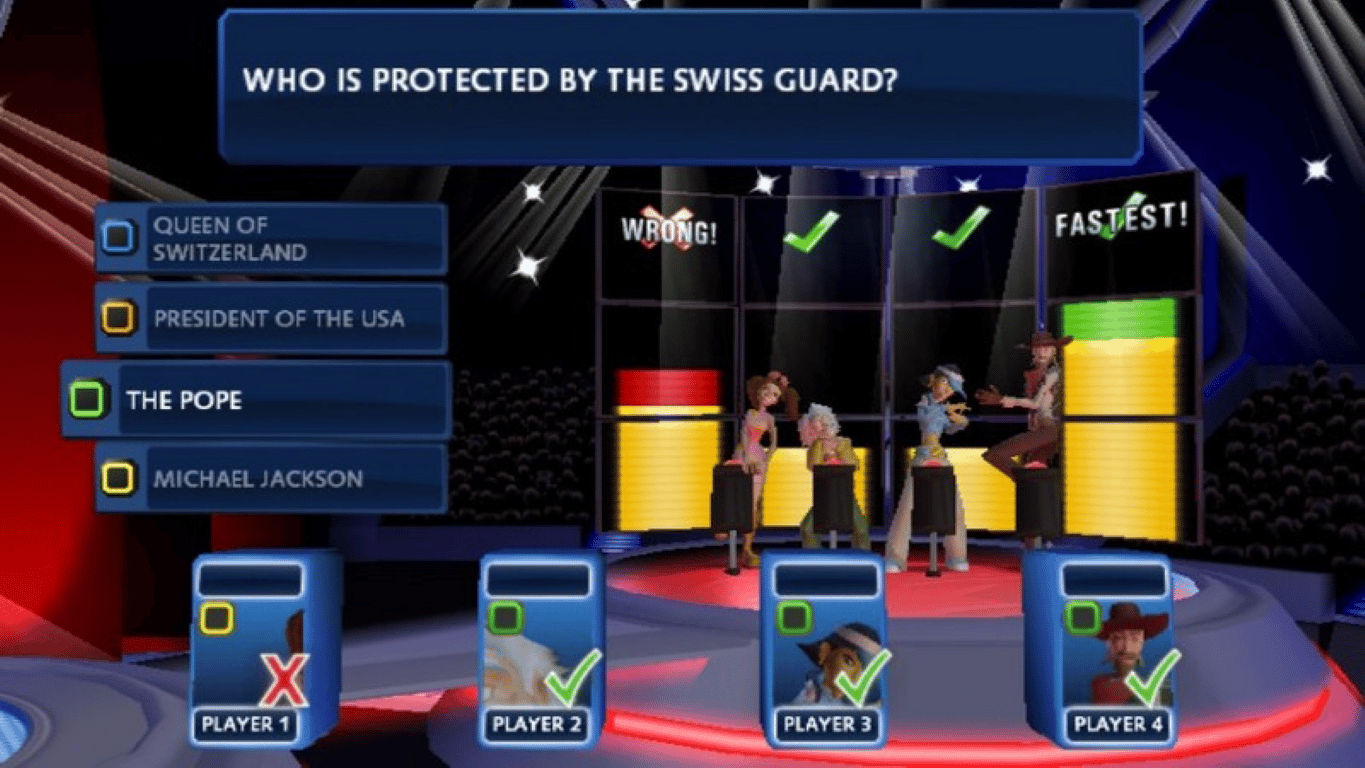 Due to the huge success of past smash hits including Buzz!™: The Sports Quiz and Buzz!™: The Music Quiz, Buzz’s diva-like studio demands are being met by execs and his fame continues to flourish. More and more contestants are clamouring to get on Buzz!™: The Mega Quiz and come face to face with the bronzed cheesemonger himself. With eight contestants now able to take part, auditions were held and new general knowledge nuts have emerged, including a masked Mexican wrestler, a little old grandmother and the mighty superhero, Quiz Man.