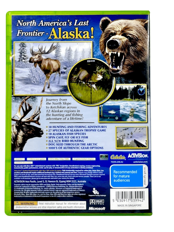 Excellent Condition & 100% Complete with Contents: CABELA’S ALASKAN ADVENTURES for Xbox 360. This preowned game is in superb condition and comes complete with case, cover, manual / booklet, and game disc.