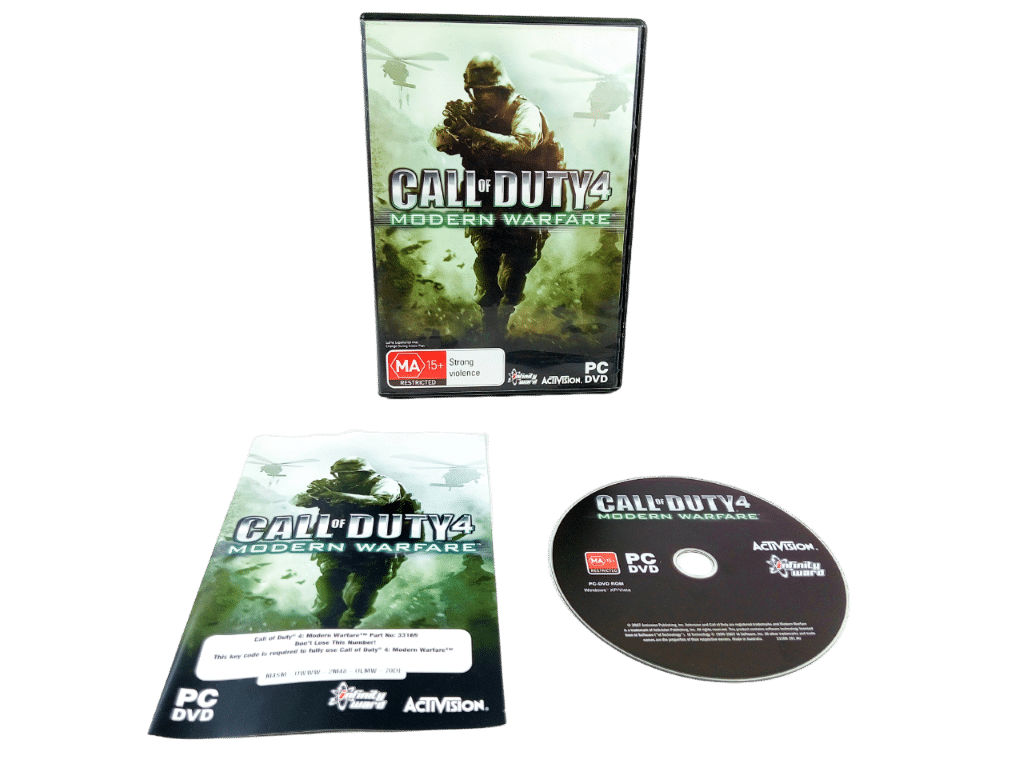 Call of Duty 4 Modern Warfare (PC) game. This preowned PC game is in excellent condition and includes pictured case + contents. Any keycodes will have been used, so buyer may need to access a new keycode online.