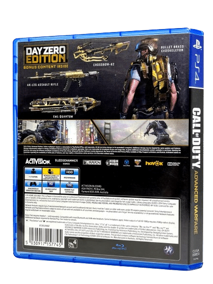 RARE DAY ZERO EDITION LIMITED COVER RELEASE in excellent condition: CALL OF DUTY ADVANCED WARFARE DAY ZERO EDITION for SONY PlayStation 4 / PS4. This preowned game is in superb condition, complete with Authentic Day One Edition Cover, Case, carded insert, and Game Disc.