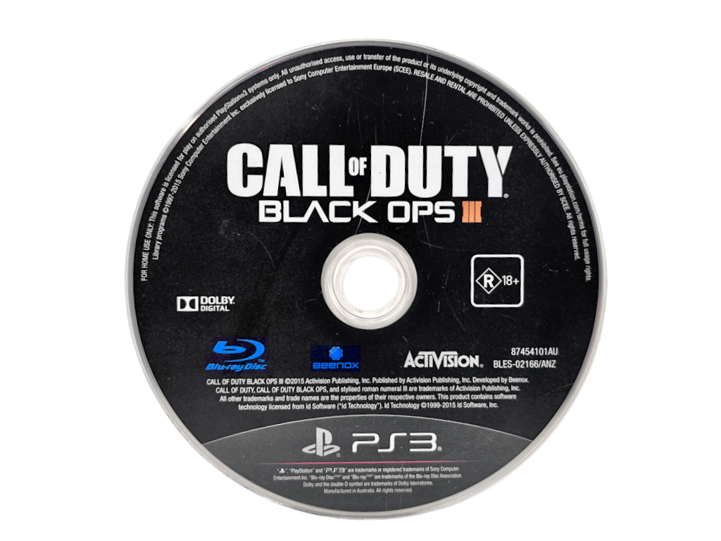 Call of Duty Black Ops III for SONY PlayStation 3 / PS3. This preowned game disc is in good playing condition with visible light markings and scratches which do not affect game play in any way. Disc comes inside an empty blank case. Please note that the original case is NOT included.