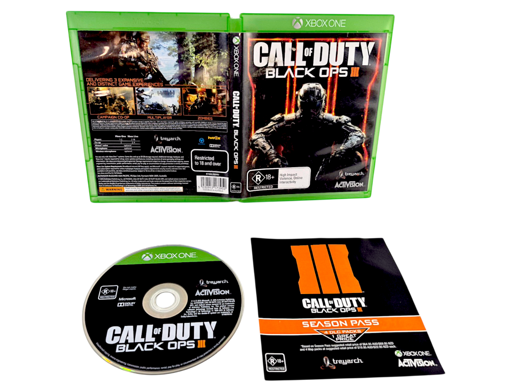 DESCRIPTION: This Xbox One edition includes the case, disc, and Season Pass promotional insert. Black Ops III delivers three major modes: a futuristic campaign, competitive multiplayer, and the fan‑favourite Zombies experience. With its fast movement system, customisable loadouts, and co‑op support, it remains one of the most replayed entries in the series. A strong addition for collectors building a full Call of Duty shelf or players wanting a robust shooter with plenty of content.