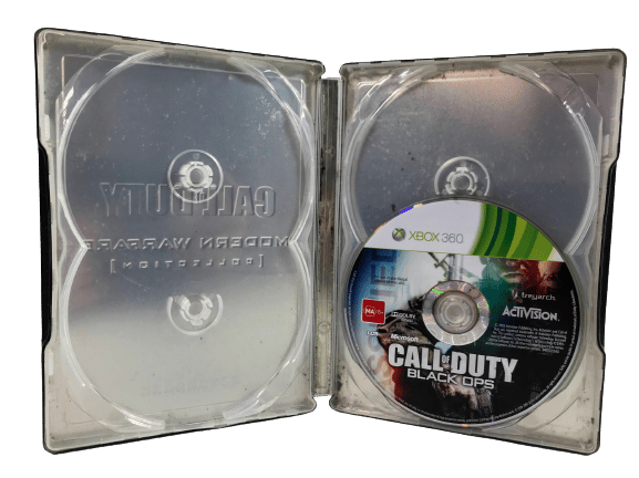 Call of Duty Black Ops for XBox 360 inside rare Steel Case Modern Warfare Collector’s Tin. This preowned game is in good condition, and includes an official Call of Duty Modern Warfare Collection Limited Edition STEELBOOK. Some light cosmetic imperfections and shallow indentations on the steel case, and the disc has some fine superficial markings / cosmetic scratches, but these are very minor imperfections which do not affect game play in any way.