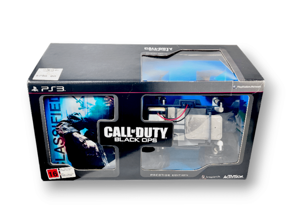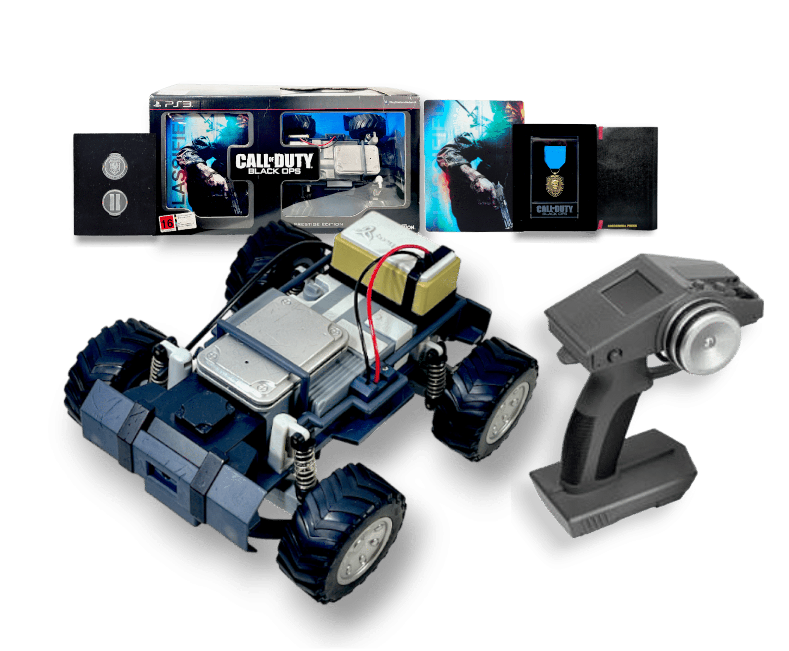 RARE LIMITED EDITION Call of Duty: Black Ops – Prestige Edition BUNDLE for SONY PlayStation 3 (PS3). This preowned LARGE COLLECTOR’S BUNDLE (WITH LARGE RADIO CONTROL VEHICLE) includes the following contents: