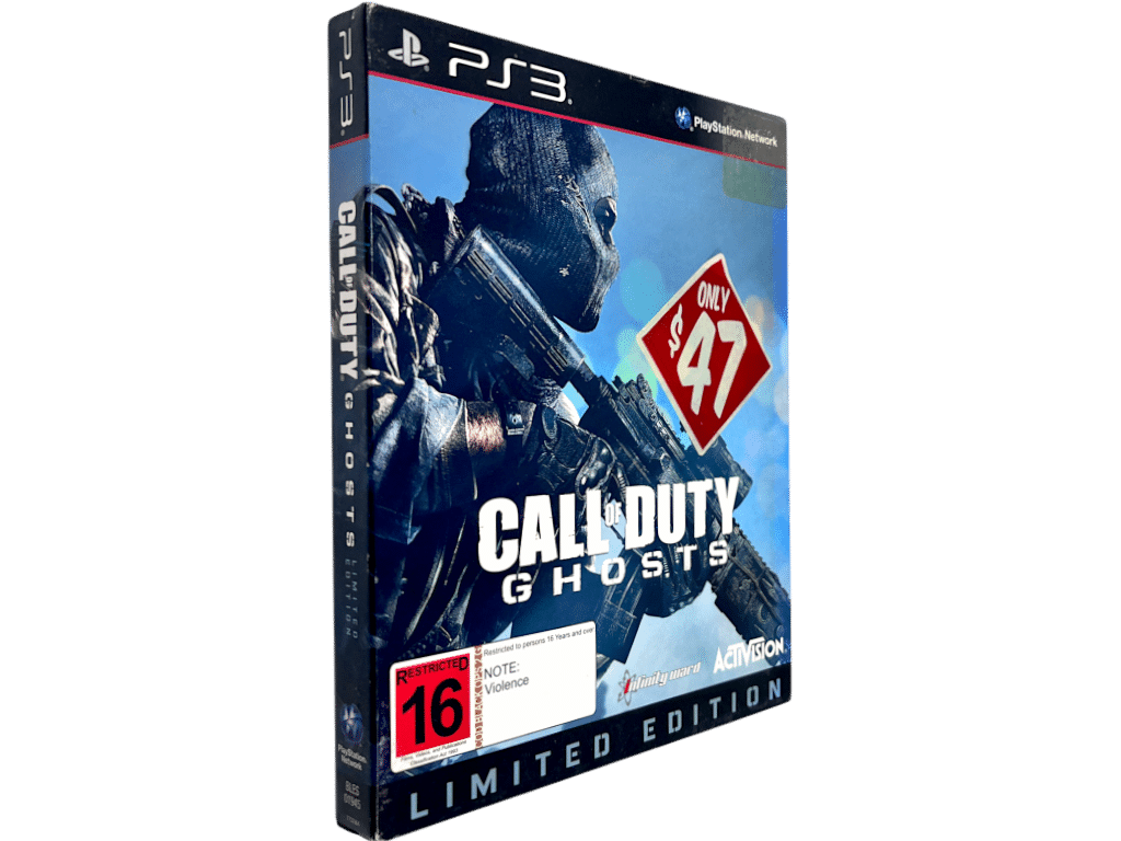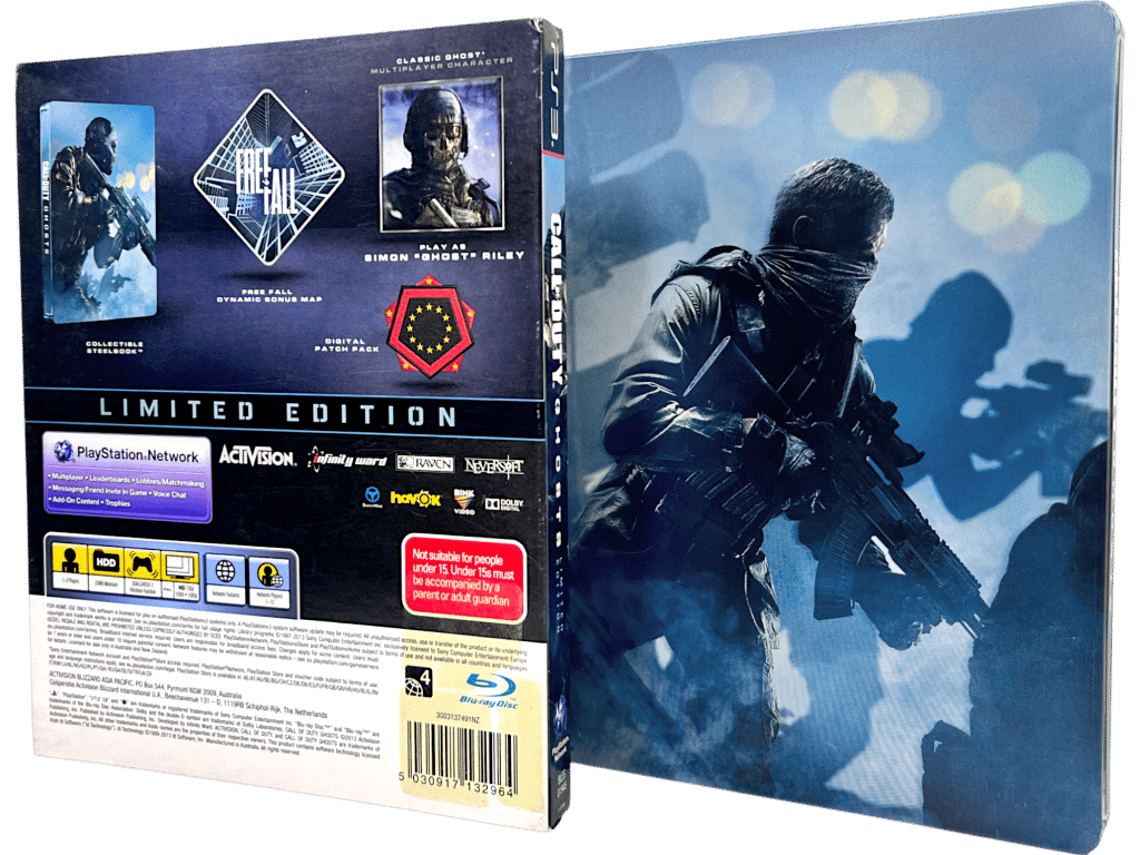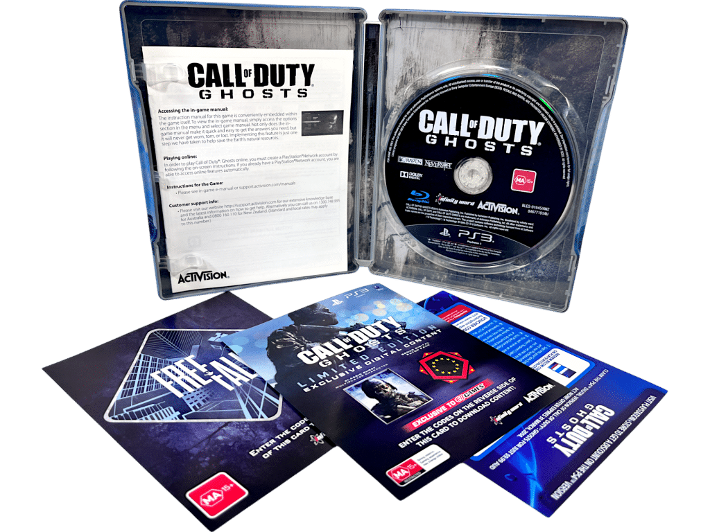 Rare Find: Excellent Condition (all inner contents MINT) & 100% complete with ALL contents, including BOTH Steelbook AND Display Box: The Official Limited STEEL CASE Collector’s Edition: Call of Duty Ghosts Steel Edition for SONY PlayStation 3 / PS3. This preowned authentic limited Steelbook Collector’s Edition includes all inner contents in Pristine Condition: Steelbook / Steel case, manual, carded insert, and game disc. Display box also in great condition with a price sticker as pictured. Add this to your collection today and display it proudly!