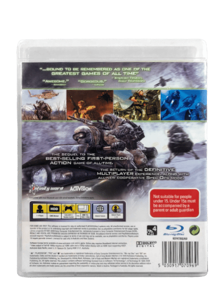 Excellent condition & 100% complete with contents: CALL OF DUTY MODERN WARFARE 2 / COD MW2 for SONY PlayStation 3 / PS3. This preowned game is in superb condition and includes original case + cover + manual / booklet + game disc. Case has some mild plastic wear, but this is purely cosmetic, and all of the internal contents are fantastic.