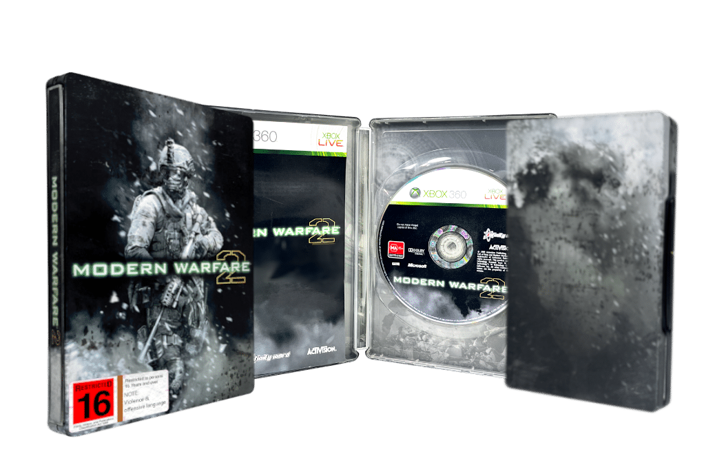 Rare LIMITED STEEL CASE COLLECTOR’S EDITION with GENUINE BLACK DISC + BLACK MANUAL: CALL OF DUTY MODERN WARFARE 2 STEEL EDITIONĀ / COD MW2 STEELBOOK EDITION for Xbox 360 (and also plays on XBox One!). This preowned authentic Steel Case Collector’s Edition is in good condition and includes each of the manual and game disc inside – both authentic BLACK prints. Game Disc superb. Steelbook structurally excellent and with surface aging spots (and these purely cosmetic) consistent with time which are commonly found on steelbooks which have been shelved for 15 years. Refer photographs.
