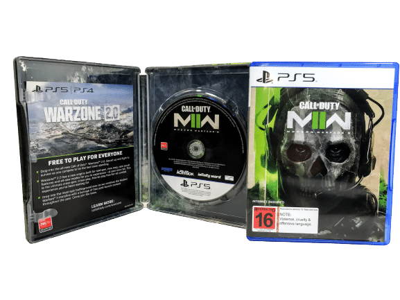 AUTHENTIC LIMITED EDITION BOXED STEEL CASE COLLECTOR’S SET in Excellent Condition & 100% Complete with Contents: Call of Duty Modern Warfare 2 STEELBOOK BUNDLE for SONY PlayStation 5 / PS5. This preowned genuine Limited Collector’s Box Set is in pristine condition. Outer cardboard display box has some light card wear, but the internal contents are Mint. Add this to your collection today.