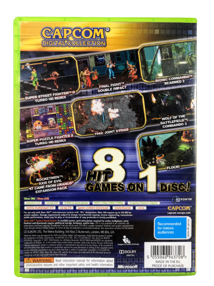 Excellent Condition & 100% Complete with Contents: The CAPCOM Digital Collection for Xbox 360. This preowned game comes complete with case, cover, leaflet, and game disc. A tidy collector’s item.