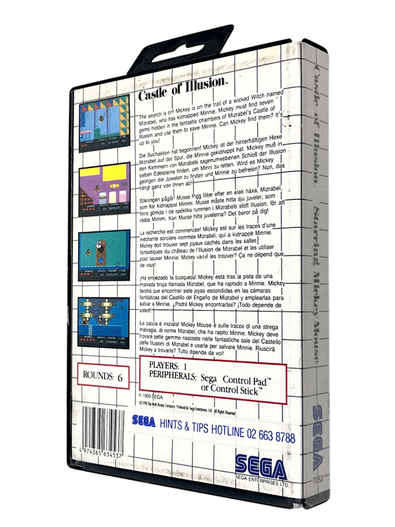 The storyline is fairly simple. Mickey’s girlfriend, Minnie, has been kidnapped by the evil witch, Mizrabel. Mickey has to make his way through six levels in the Castle Of Illusion, collecting seven gems (forming different colours of the rainbow) that will allow him to confront and defeat Mizrabel, and save Minnie.
