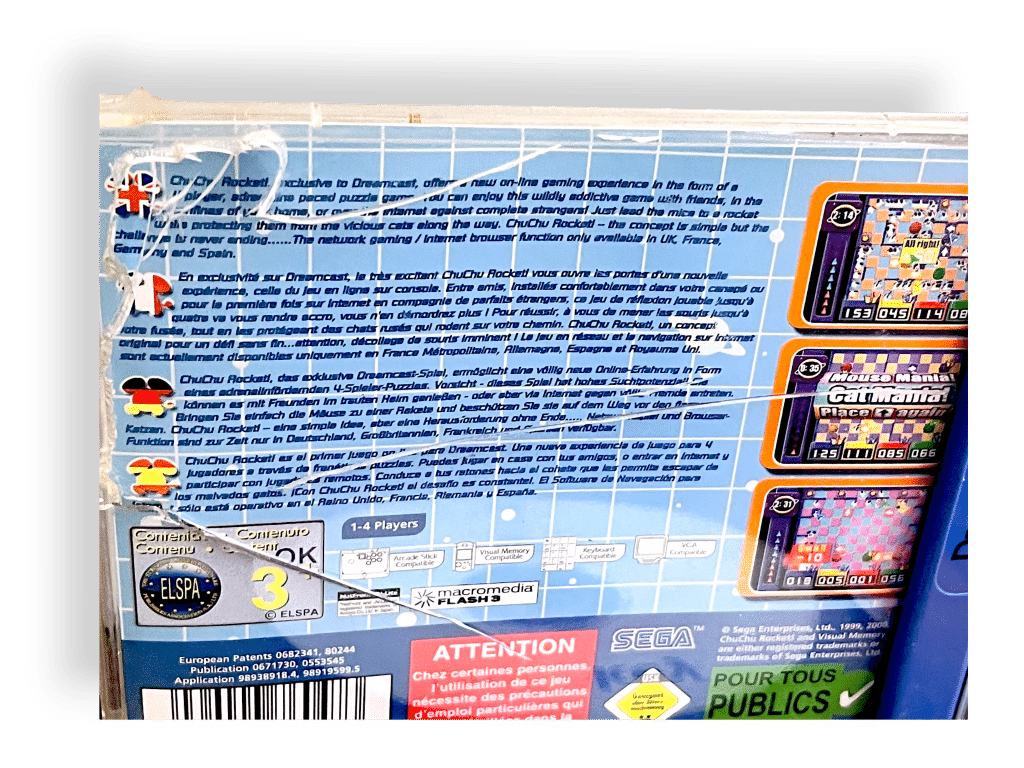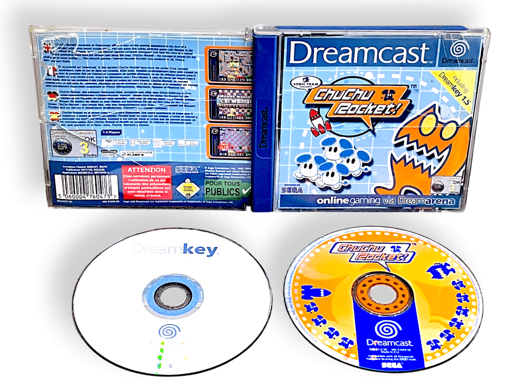 TWO DISC EDITION (and all internal contents in Excellent Condition): ChuChu Rocket! (Sega Dreamcast). This pre-owned Sega Dreamcast game features all internal contents in excellent condition. The paper work and game disc are each superb. The case has some plastic damage typical of these official Sega Dreamcast game cases. Plastic cracks on the front and back plastic panels, and one of the tiny plastic hinges missing. But each of the internal contents are fantastic and overall this is a tidy and complete collector’s item. Refer photographs.