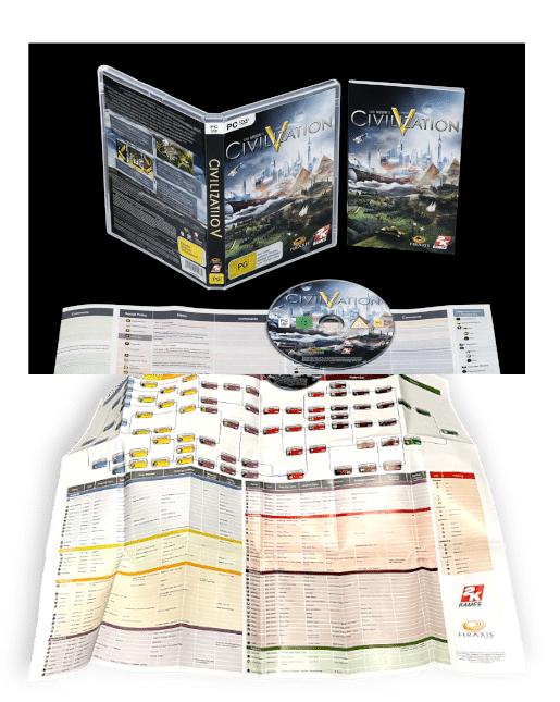 Civilization V (PC) with Tech Tree Reference Chart. This pre-owned PC game is in mint condition and complete with internal content as pictured. A beautiful collector’s bundle, refer photographs.
