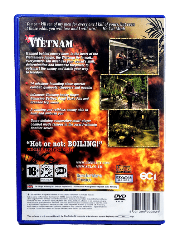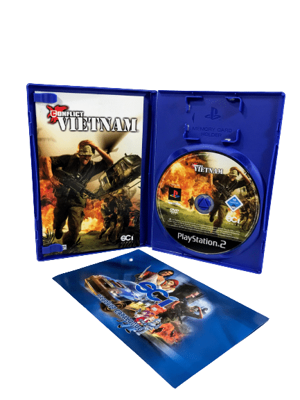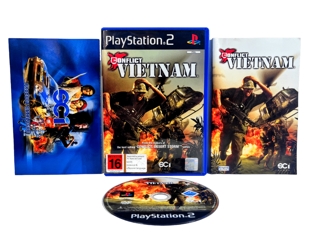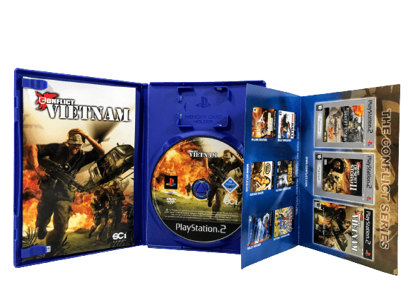 Good condition & 100% complete with contents: Conflict: Vietnam for SONY PlayStation 2 / PS2. This preowned game comes complete with case + cover + manual / booklet + ECI catalogue (each in excellent condition + game disc. The disc has some light scratches, but these do not affect gameplay or performance in any way, and all other contents are fantastic.