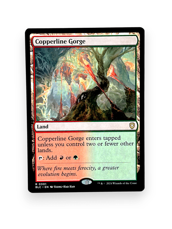 A premium Gruul fast land that excels in aggressive and midrange strategies. Copperline Gorge enters untapped early and helps power out fast red-green threats in Modern and Commander. The molten forest artwork gives this version a vibrant, fiery edge, enhancing its collectible appeal while retaining strong competitive playability.