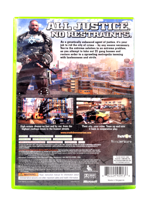 - True next-generation visuals. Harnessing the power of Xbox 360, “Crackdown” players enforce justice against the backdrop of a crime-ridden metropolis that is massive in scale,