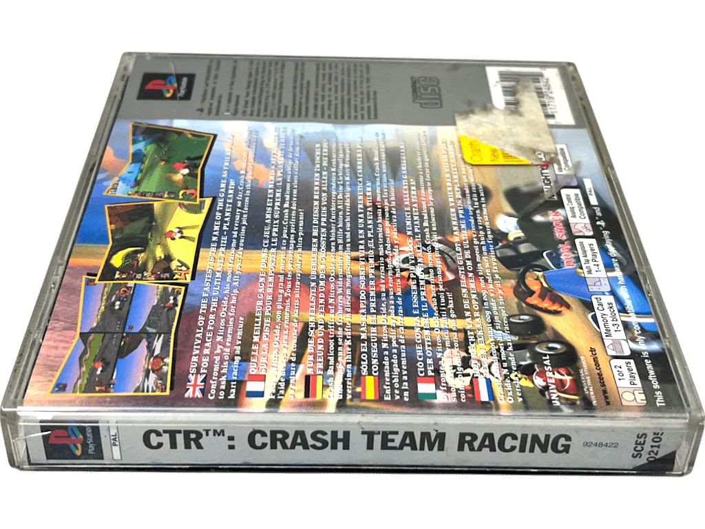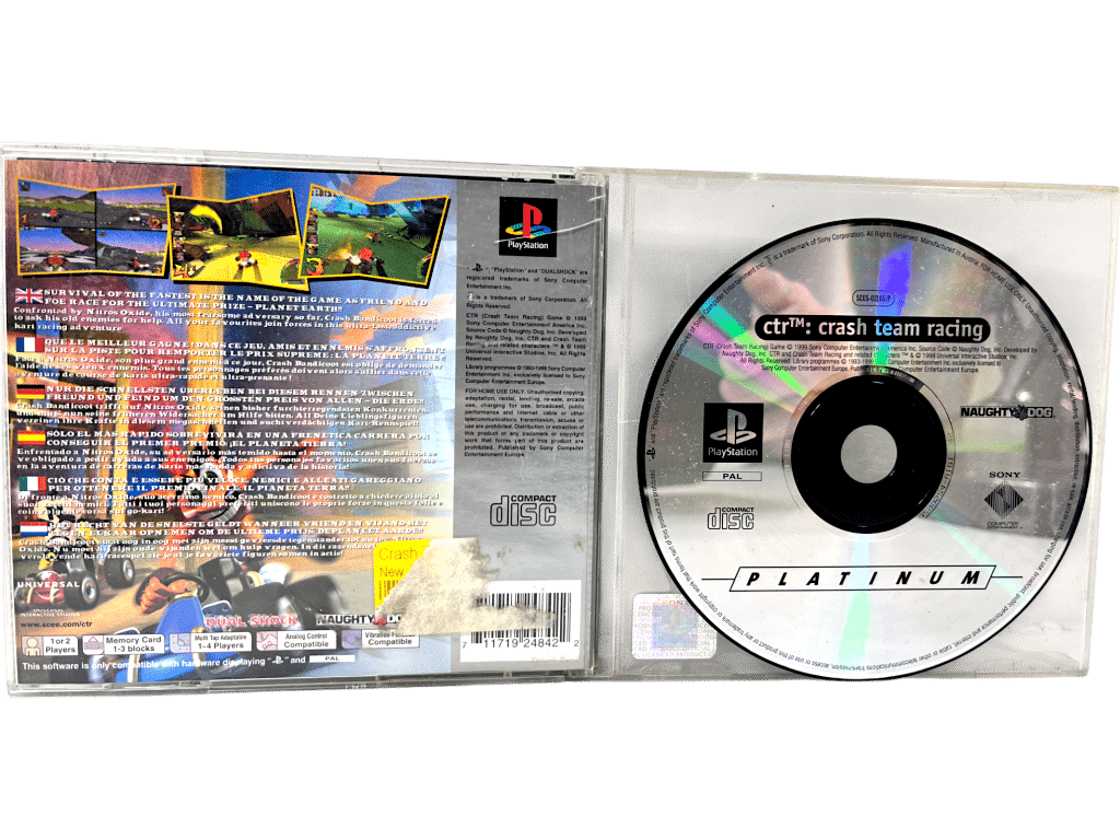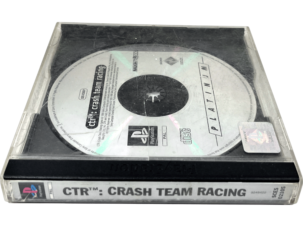 CTR CRASH TEAM RACING for SONY PlayStation (PS1). This preowned game includes Original Print case + back cover + game disc. Does not include front cover slip or manual. Disc in good condition. Case has some minor plastic cracks, but these are purely cosmetic.