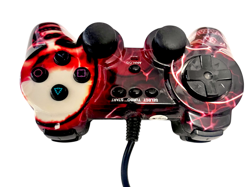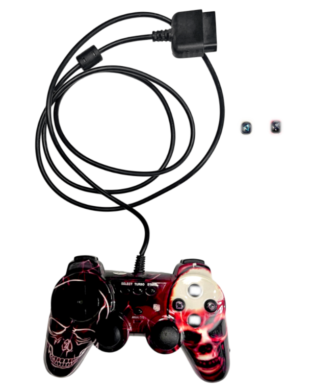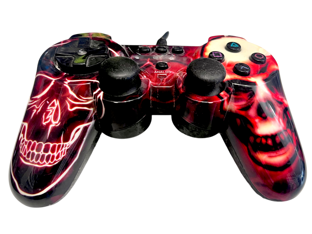 DESCRIPTION: Eye-catching wired controller featuring a striking skull artwork design. Built in the familiar PlayStation-style layout with dual analog sticks and comfortable grips. Ideal as a replacement controller or a unique addition to a gaming setup for players who like bold custom designs.