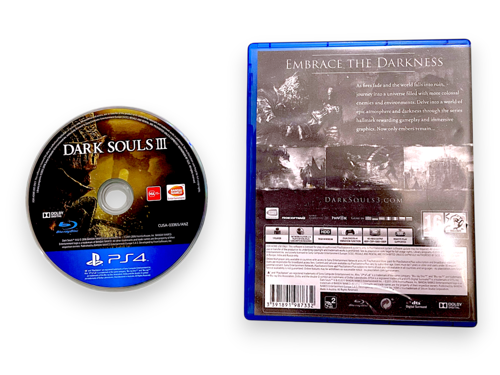 Dark Souls III (PS4). This pre-owned Sony PlayStation 4 game disc is in excellent condition and includes case and pictured black and white photo copied cover (note that this is NOT the original paper cover). Refer to photographs.