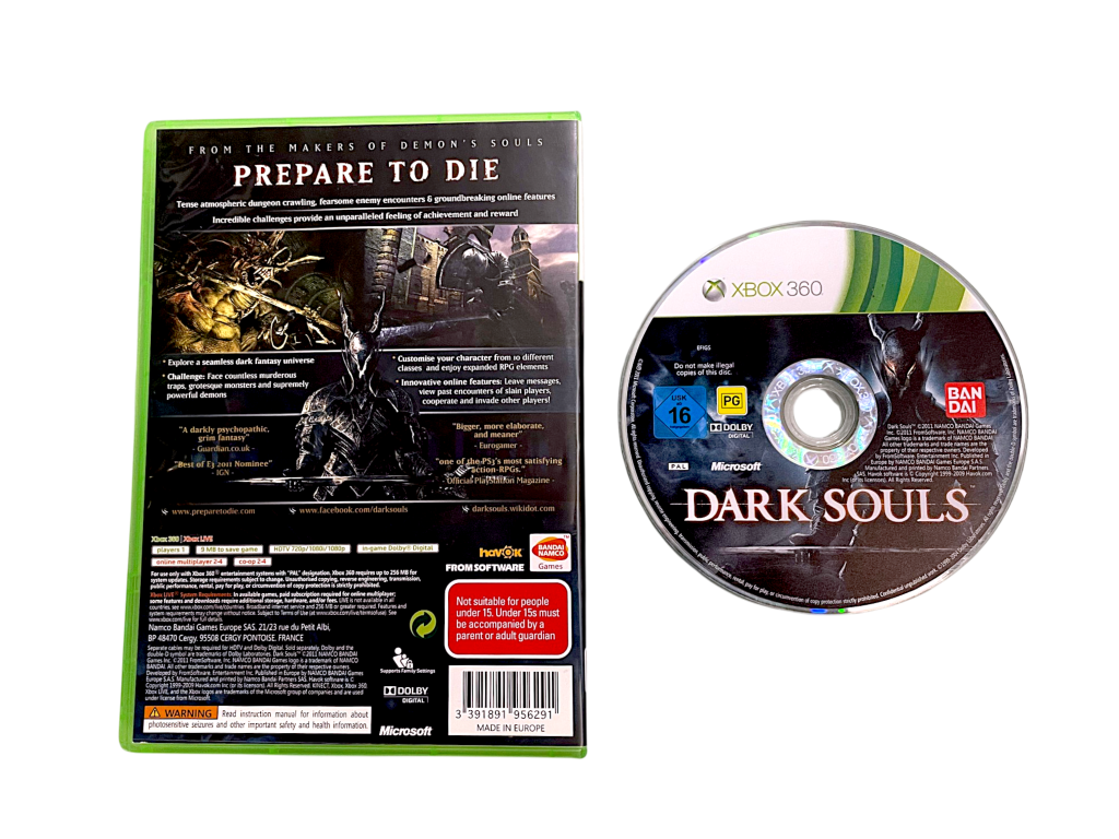 Dark Souls (Xbox 360). This pre-owned game is in good condition with mild disc surface imperfections only which do not hinder gameplay or performance in any way. This game includes the pictured case and contents. Refer to the photographs.
