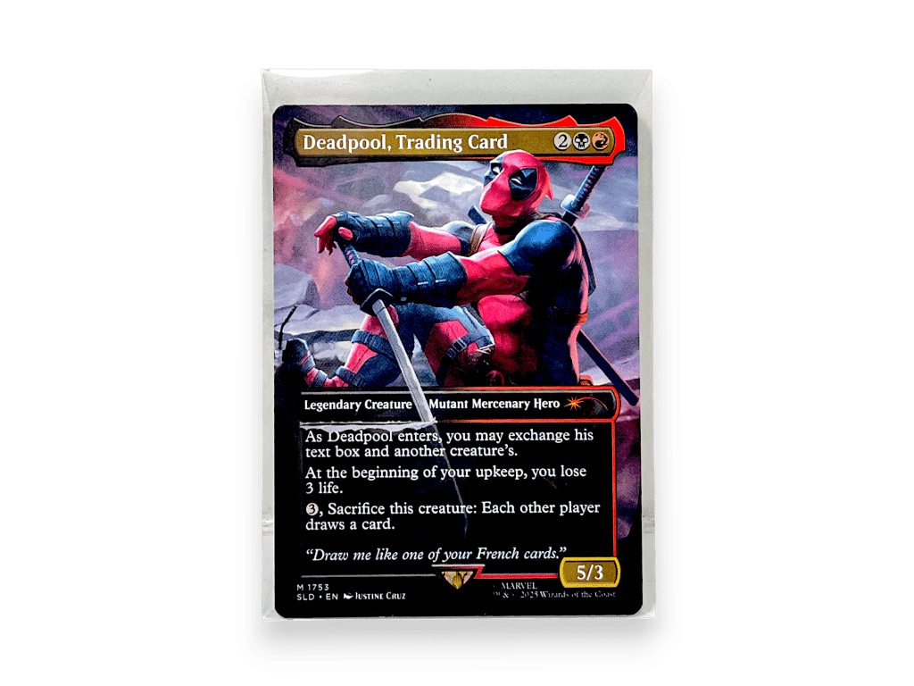 A Legendary Creature – Mutant Mercenary Hero featuring text-swapping effects, life loss, and card draw via sacrifice. Wild, unpredictable, and hilarious, this Deadpool crossover card is a standout Secret Lair collectible with unique mechanics and bold art.