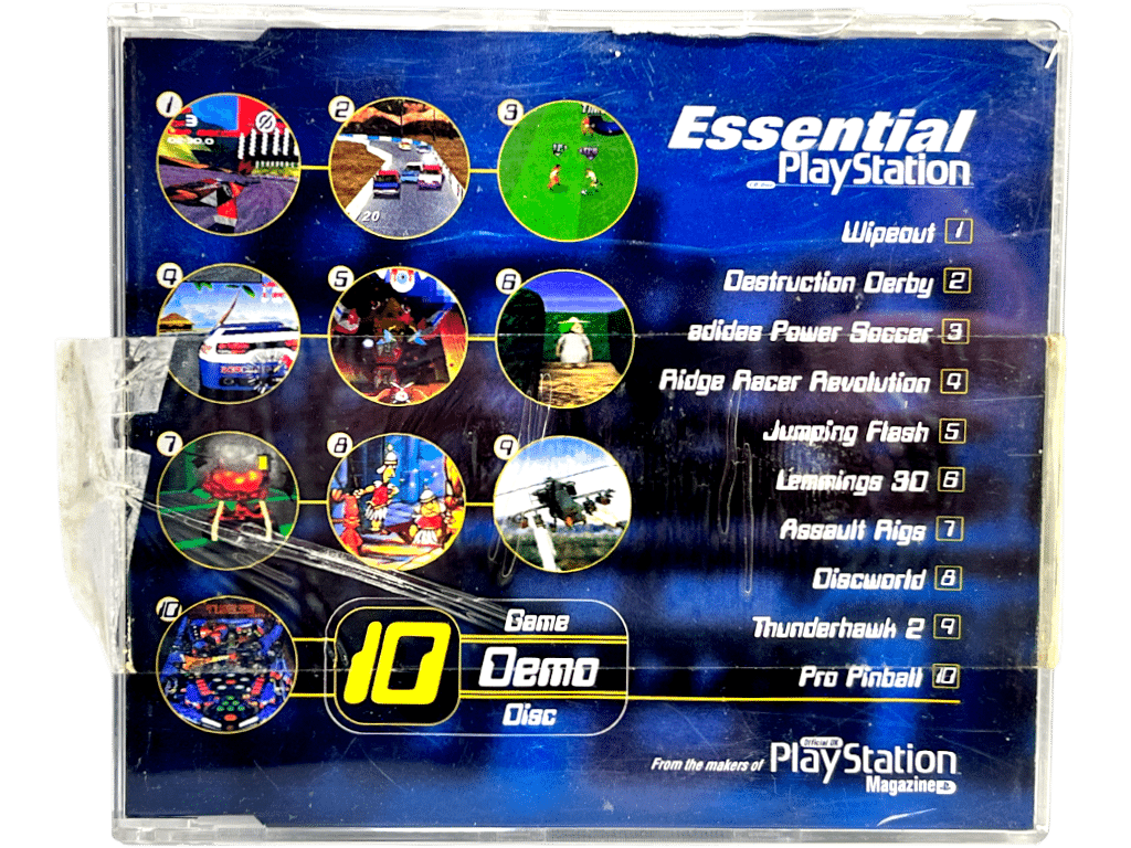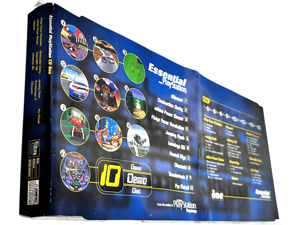 RARE OFFICIAL Demo Pals Essential PlayStation Volume 1 SCED-00502 711719641629 for SONY PlayStation. This preowned authentic VOLUME 1 / CD 1 / DISC 1 in the series is in MINT condition – cover and disc like new, and case still with its original piece of sealer tape on it (tape has yellowed with age). Case has light shelf wear consistent with time, but the case is the genuine matching case and all inner contents are pristine. A very tidy collector’s item.
