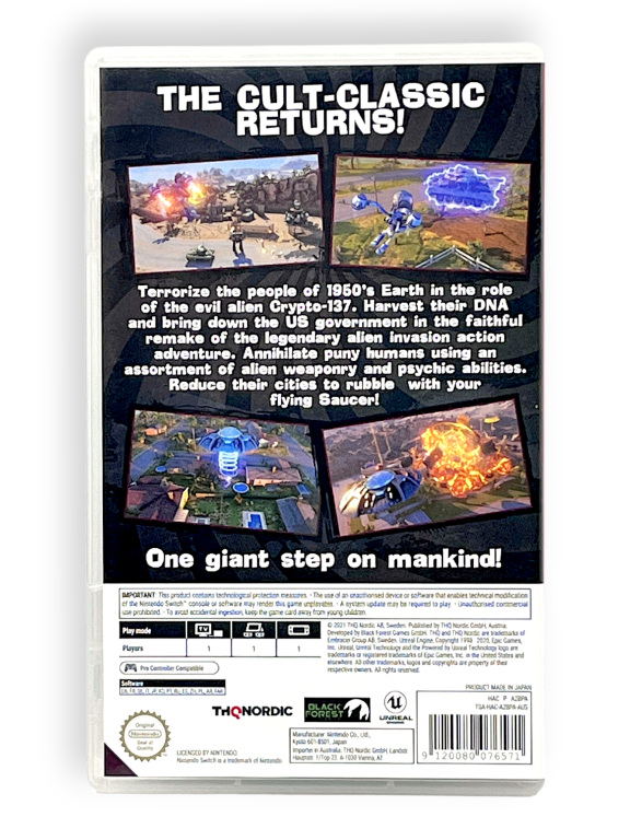 DESCRIPTION: Destroy All Humans! on Nintendo Switch is a humorous action-adventure game where players take on the role of an alien invader wreaking havoc on 1950s Earth. Featuring open-ended missions, destructive weapons, and telekinetic abilities, the gameplay encourages experimentation and chaos. The Switch version allows for portable alien mayhem, making it easy to jump into missions on the go. With its satirical tone and unique premise, it stands out from traditional action titles. A great pick for players who enjoy sandbox gameplay with a comedic twist and plenty of freedom.
