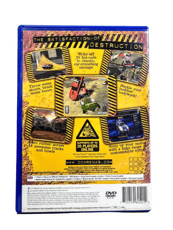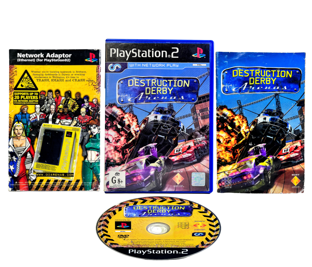 Good condition and 100% complete with contents: DESTRUCTION DERBY ARENAS for SONY PlayStation 2 / PS2. This preowned game is in good condition and comes complete with case + cover + manual / booklet + game disc. Paper cover has a thin line of paper fraying along the top edge, but this is purely cosmetic. Disc has superficial scratches.