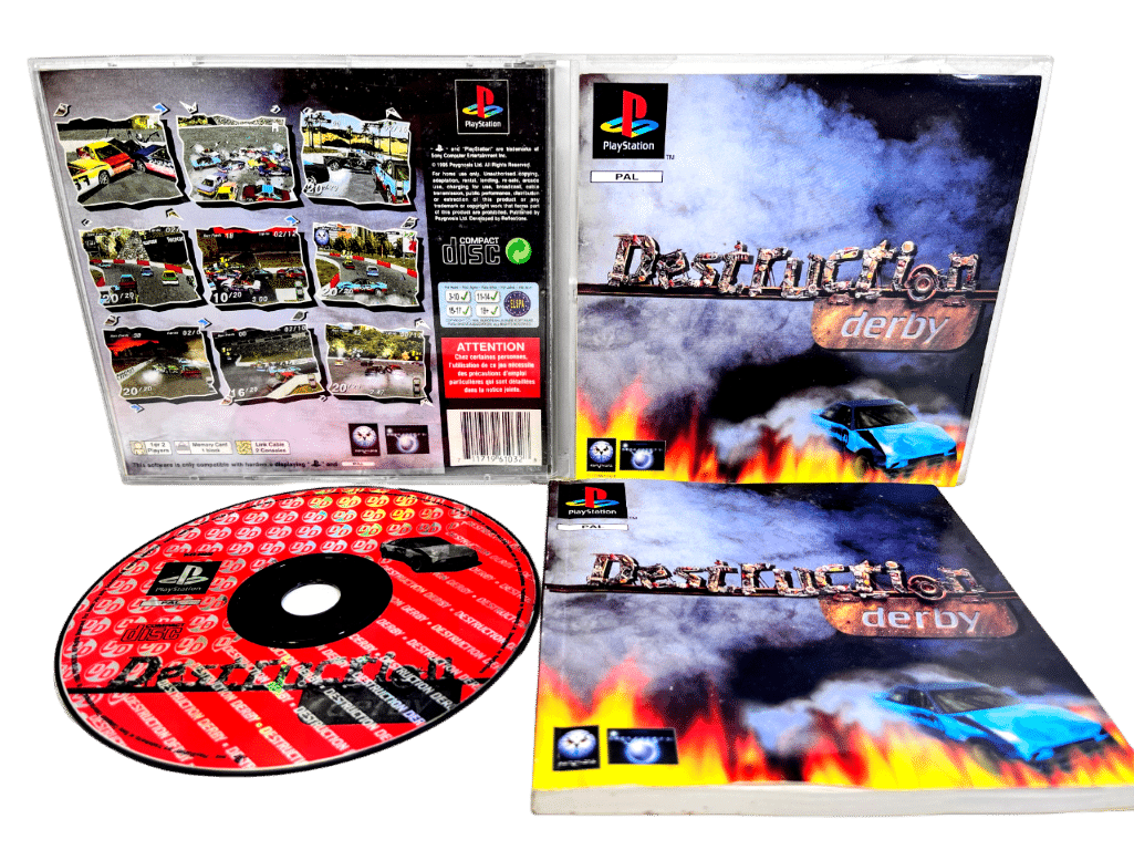 Excellent condition & 100% complete with contents: Destruction Derby for SONY PlayStation / PS1. This preowned game is in superb condition for its vintage and comes complete with case, covers (both front and reverse cover sleeves), manual / booklet, and game disc. The only imperfection I could find was one small plastic crack on the very top edge of the case, and this wasn’t immediately obvious until I was up close and looking hard for it. Overall, a tidy and complete collector’s item.