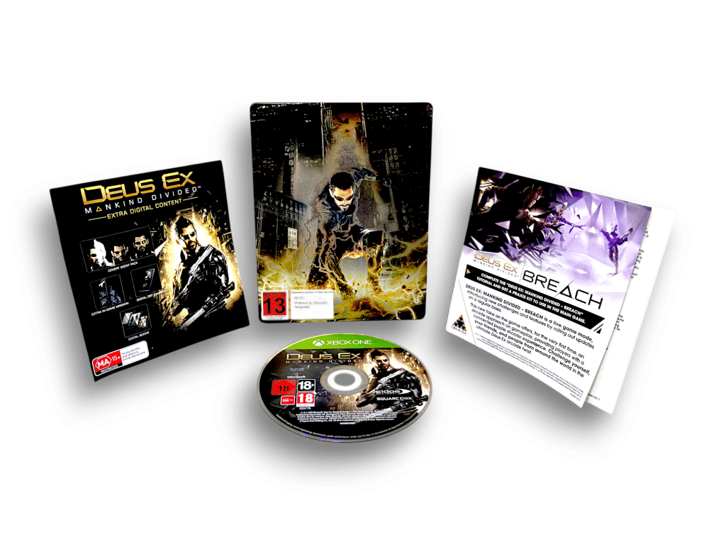 Deus Ex: Mankind Divided (Xbox One) STEEL CASE COLLECTOR’S EDITION. This preowned authentic Limited Release Steelbook Edition is in Excellent Condition as pictured. This Special STEEL CASE COLLECTOR’S EDITION. includes pictured contents. A rare collectible to be added to any serious collector’s library. Refer photographs.