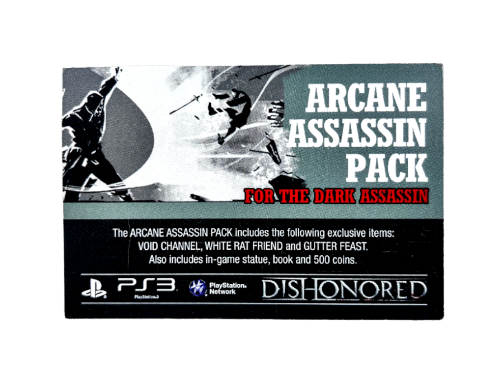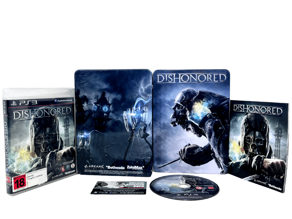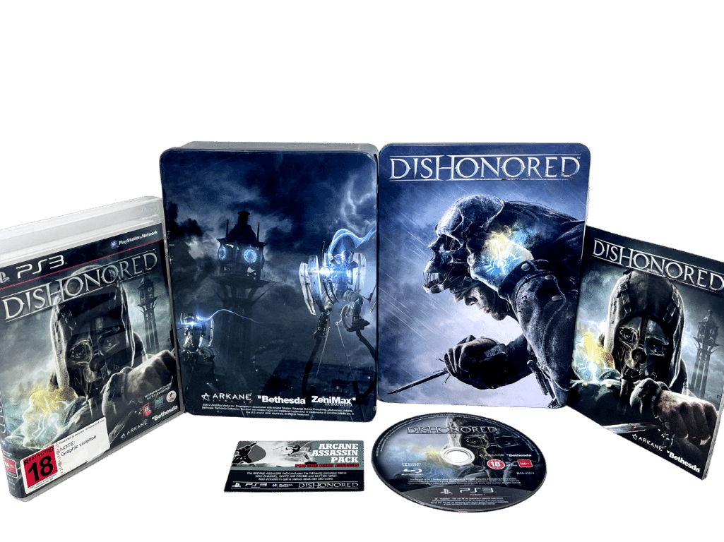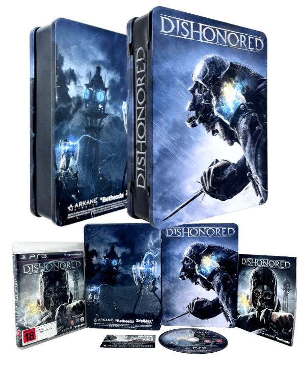 RARE LIMITED LARGE COLLECTOR’S STEEL TIN EDITION: DISHONORED Limited Edition / Dishonoured Limited Steel Tin Edition for SONY PlayStation 3. This preowned authentic LARGE Collector’s Tin Edition is in pristine condition, and includes inner game case + cover + manual / booklet + Arcane Assassin Pack Card (voucher code will have expired) + game disc, all inside the large Collector’s Tin with removeable lid.