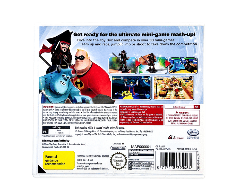 Mint condition & 100% complete with contents: Disney Infinity for Nintendo 3DS. This preowned game comes complete with case + cover + manual / booklet + game cartridge. A very tidy and complete collecrtor’s item.