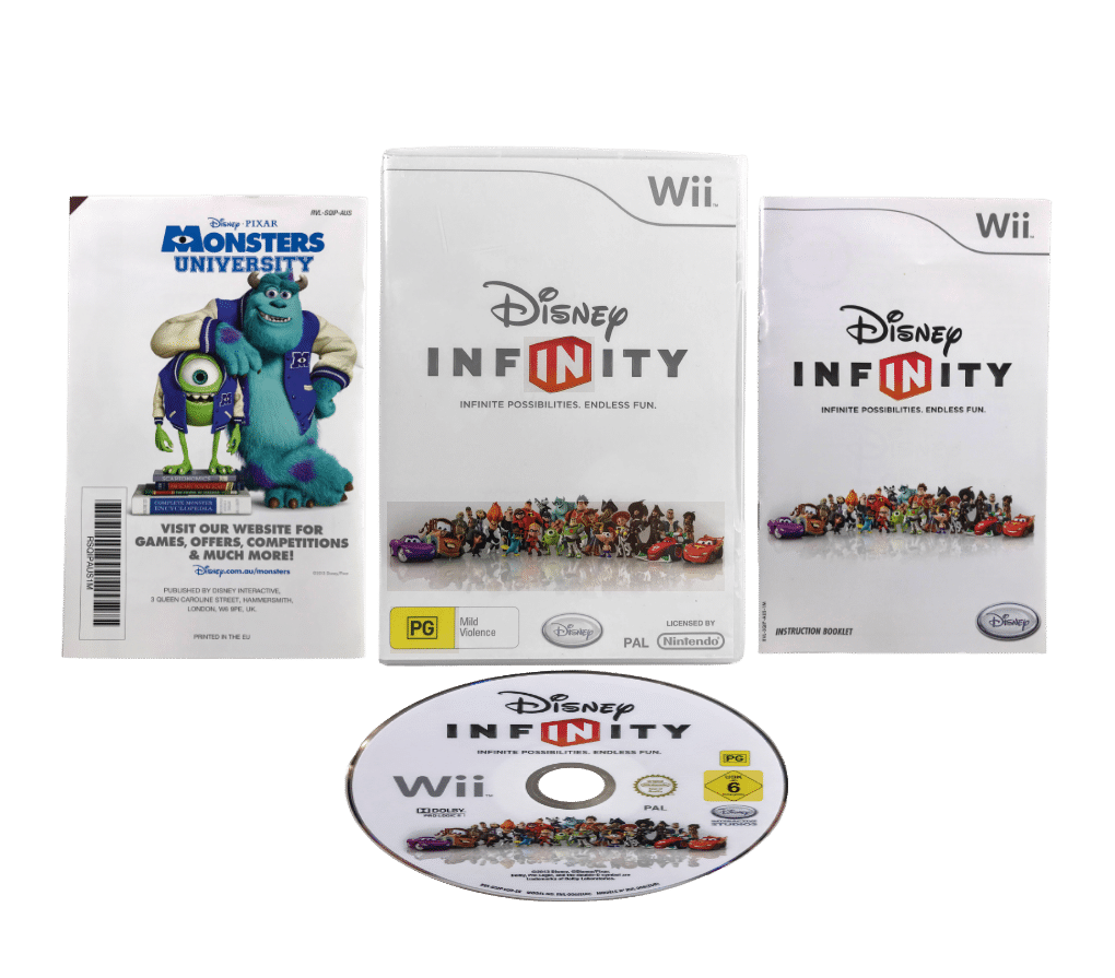 The Original Disney Infinity Game for Nintendo Wii in Good Condition & 100% complete with contents. This preowned game includes case, cover, manual / booklet, and game disc. Case has some light laminate plastic wear, but the game disc and manual inside are each in excellent condition.