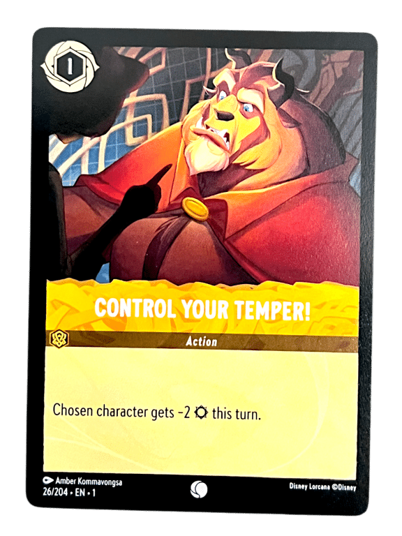 Disney Lorcana The First Chapter – Control Your Temper (Beast – Action). This authentic Disney Lorcana Series 1 The First Chapter card is in excellent condition. Actual item pictured.