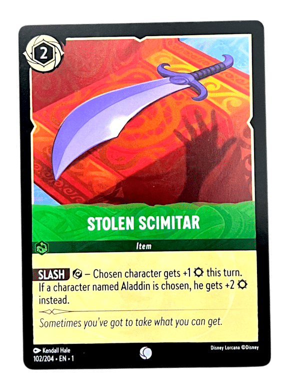 Disney Lorcana The First Chapter – Stolen Scimitar (Item). This authentic Disney Lorcana Series 1 The First Chapter card is in excellent condition. Actual item pictured.