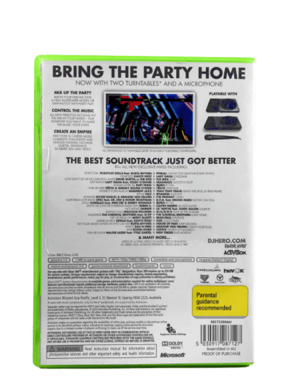 DJ Hero 2 (XBox 360) *TURNTABLE + GAME – COMPLETE BUNDLE* for XBox 360. This preowned genuine DJ Hero XBox 360 Turntable + Game Bundle is in good condition and perfect working order. Includes DJ Hero 2 complete with manual. Turntable tidy with only superficial markings and cosmetic imperfections. The small plastic battery hatch off the back is missing, but the batteries stay in place without it, and can be taped securely also. Game disc has a faint ring scratch, but this is purely cosmetic and does not affect gameplay in any way. A complete playing bundle.