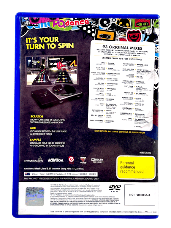 Excellent condition & 100% complete with manual: DJ Hero The Video Game for SONY PS2. This preowned game comes complete with case, cover, manual / booklet, and game disc.