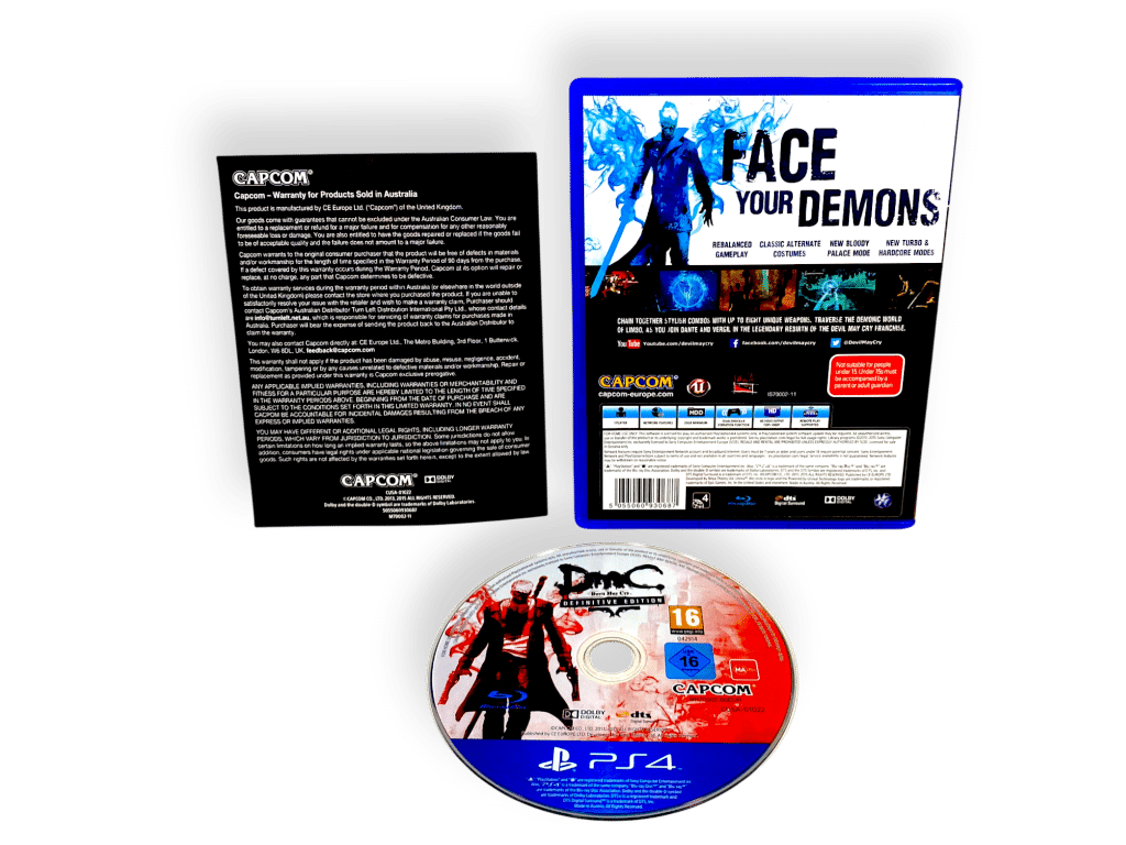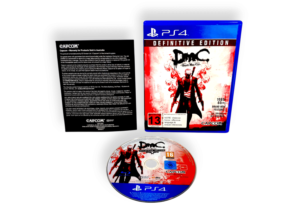 DmC: Devil May Cry – Definitive Edition (PS4). This preowned game is in mint condition and complete with original case + cover + promo card + game disc.