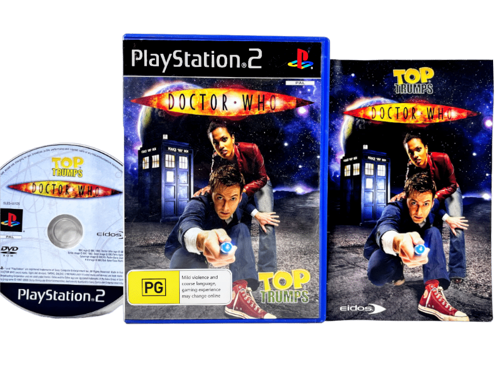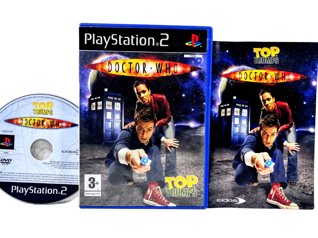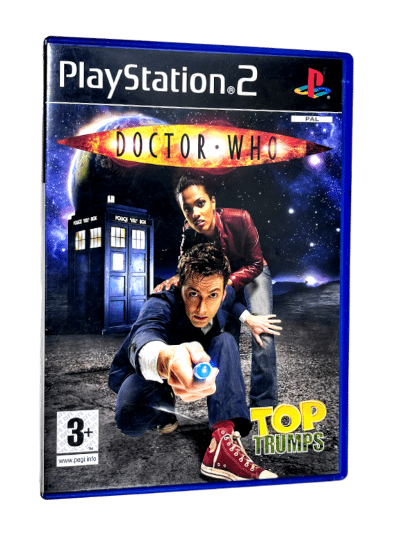 Good Condition & 100% complete with contents: Doctor Who the game for SONY PlayStation 2 / PS2. This preowned game comes complete with case + cover + manual / booklet – each in excellent condition. Game disc has some very fine superficial markings / cosmetic scratches, but these are purely cosmetic and do not affect game play in any way, and all other contents are superb. A game by Top Trumps.