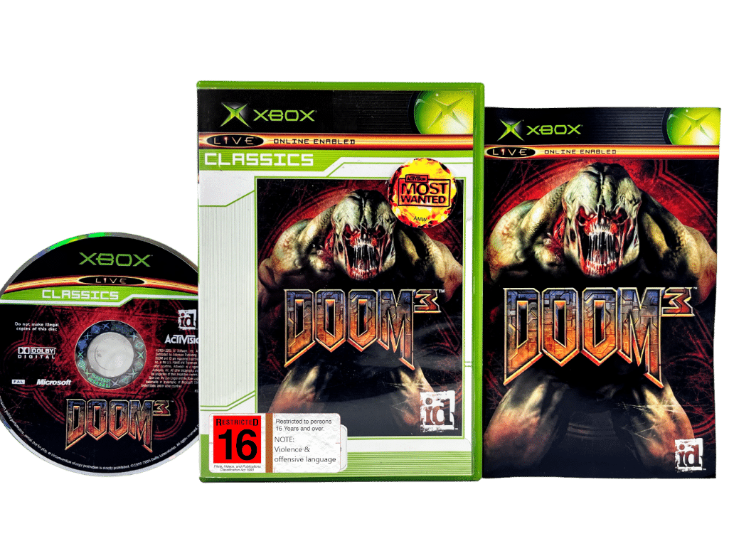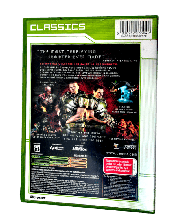 RARE FIND: AUTHENTIC CLASSICS EDITION in excellent condition & 100% Complete with Contents: DOOM 3 / DOOM III CLASSICS EDITION for Original XBox. This preowned authentic Xbox Classics edition is in superb condition and comes complete with case + cover + manual / booklet + game disc. A tidy and complete collector’s item, and a rare PAL green case Classics Print (not to be confused with the common “Limited Steel” edition version of the same game). Add this to your collection today!