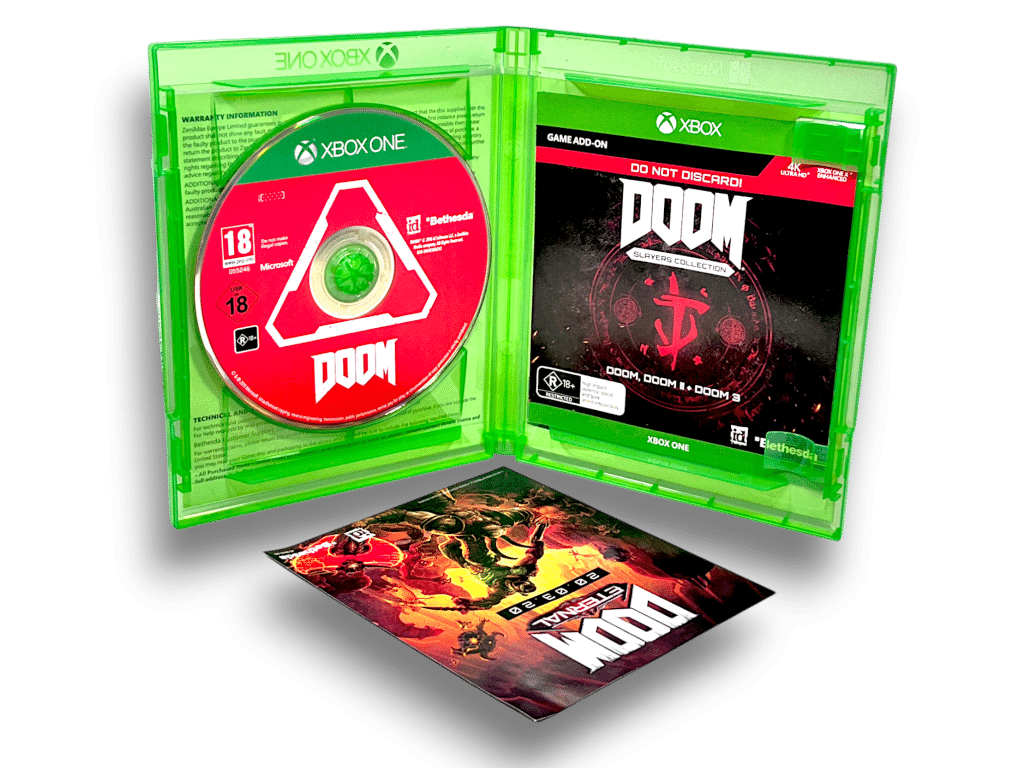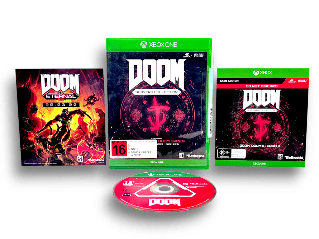DOOM Collection Bundle (Xbox One). This preowned Xbox One game is in excellent condition and complete with pictured contents. Note that any single use paper vouchers will have expired, but these were promotional downloads only and are not required for gameplay or completion. The full DOOM game is included on the game disc, without any additional “Slayer’s Collection” downloadable games or content.